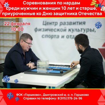 22 февраля в 10:00 турнир по длинным нардам в честь Дня защитника Отечества! Где: ФОК «Горшково». Регистрация 8-915-376-24-96 Приходи сам и приводи друзей — будет жарко