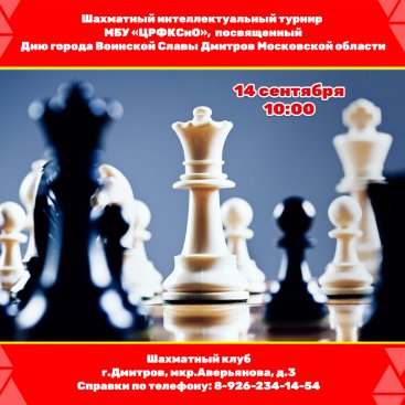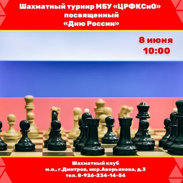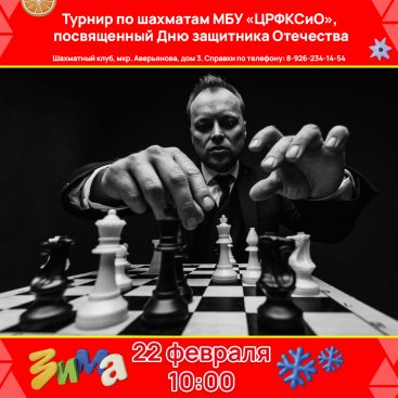 22 февраля 2026 года в Муниципальном бюджетном учреждении «Центр развития физической культуры, спорта и отдыха» отделении Шахматный клуб состоится турнир МБУ «ЦРФКСиО» посвященный Дню защитника Отечества.