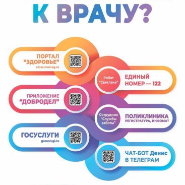 Самостоятельно, в любое время: - Портал "Здоровье" (zdrav.mosreg.ru) - Приложение "Добродел" - Госуслуги (gosuslugi.ru) С помощью ассистента, если нужна поддержка: - Единый номер 122 (Робот "Светлана") - Сотрудник "Службы заботы" в поликлинике (регистратура, инфомат) - Чат-бот Денис в Телеграм @eregistratura_mo_bot