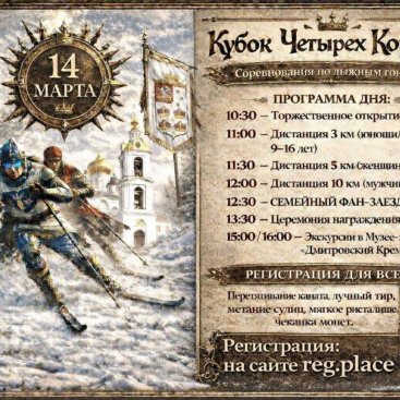 14 марта 2026 года в Дмитрове пройдет самое яркое спортивное событие этой зимы! Спортивный праздник-соревнование: «Кубок четырех корон» по лыжным гонкам. Обязательная регистрация на сайте https://reg.place/events/vhgivioa