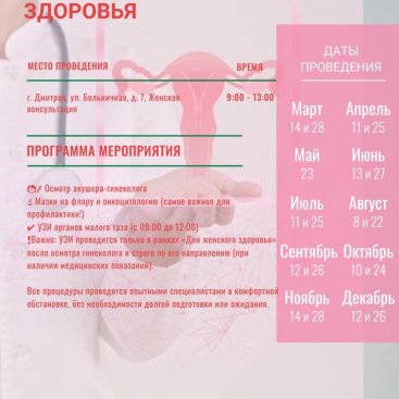 В субботу, 28 марта 2026 года Дмитровская больница проводит бесплатное профилактическое мероприятие - День женского здоровья.