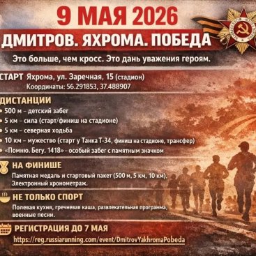 9 МАЯ 2026. БЕГ, КОТОРЫЙ ОБЪЕДИНЯЕТ. В день, когда сердце бьется в унисон с историей, мы приглашаем вас на памятный забег «ДМИТРОВ. ЯХРОМА. ПОБЕДА». Это больше, чем кросс. Это живая дань уважения героям, освободившим нашу Землю. Маршрут пройдет от легендарного Танка Т-34 в Дмитрове до финишного стадиона в Яхроме. Место встречи: стартовый городок в Яхроме (ул. Заречная, 15, стадион). Координаты: 56.291853, 37.488907. РЕГИСТРАЦИЯ – ДО 7 МАЯ. Ссылка на регистрацию: https://reg.russiarunning.com/event/DmitrovYakhromaPobeda?scrollToTop=1