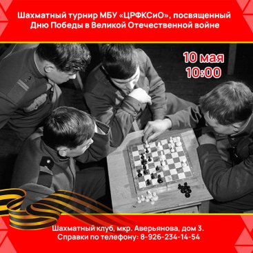 10 мая 2026 года Муниципальном бюджетном учреждении «Центр развития физической культуры, спорта и отдыха» в отделении Шахматный клуб проводится турнир, посвященный к Дню Победы в Великой отечественной войне. Количество мест ограничено, для участия в соревнованиях необходимо направить предварительную заявку. Зарегистрированным для участия в соревнованиях считается шахматист, отправивший до 08 мая 2026 года заявку для участия соревнованиях на электронный адрес hovanes@yandex.ru и получивший положительный ответ на заявку. В заявке следует указать фамилию, имя, дату рождения, id ФШР (при наличии), в каком клубе занимается, город, номер мобильного телефона.