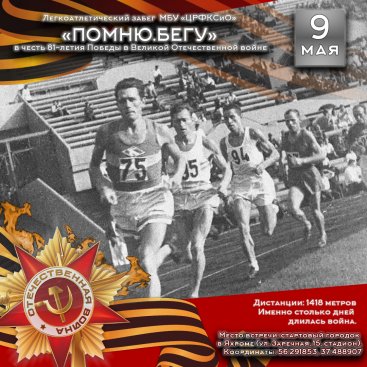 1418 дней длилась Великая Отечественная война. 1418 дней боли, подвига и мужества. В честь 81-й годовщины Победы мы приглашаем вас пробежать (или пройти шагом) эти символичные метры памяти. Что? Легкоатлетический забег «ПОМНЮ.БЕГУ.81» Где? стартовый городок в Яхроме (ул. Заречная, 15, стадион). Координаты: 56.291853, 37.488907 Когда? 9 мая Важно: Возьмите с собой портрет своего Героя. Того, кто подарил нам мирное небо. Каждый финишёр получит памятный значок. Но регистрация обязательна! Успейте зарегистрироваться до 7 мая!