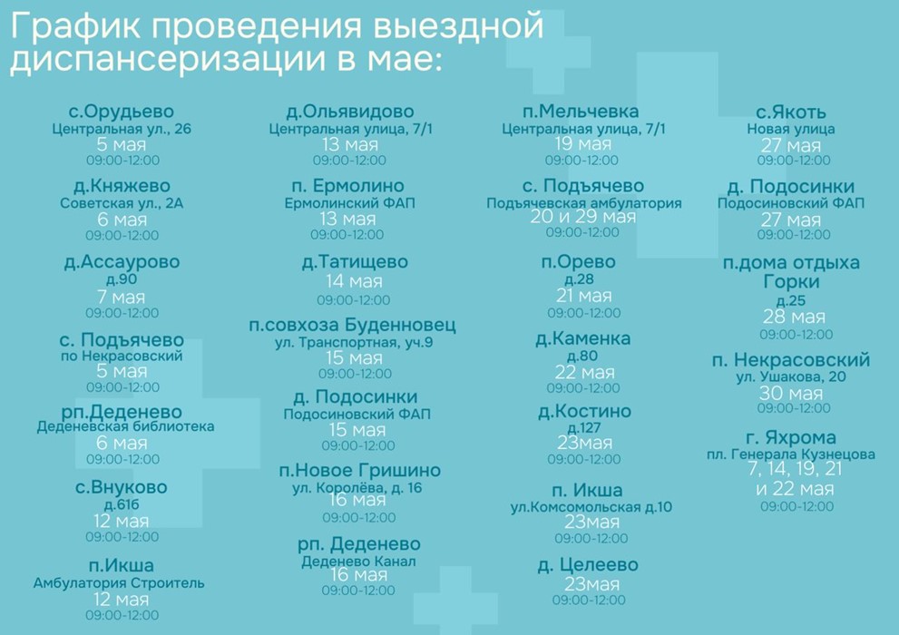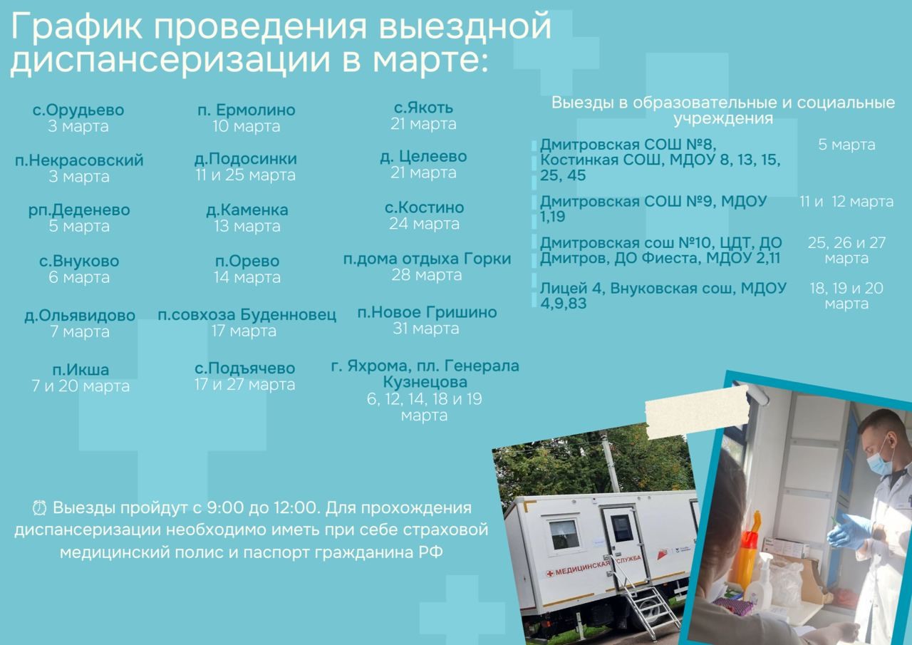 В мае 2025 года ГБУЗ МО «Дмитровская больница» продолжает проводить выездную диспансеризацию Мобильный медицинский комплекс, оснащенный всем необходимым, весь месяц будет выезжать в населенные пункты и учреждения Дмитровского округа.